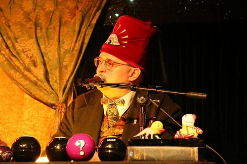 Dr. Hal Robins, also known as Dr. Howland Owll, has been a member of the Church of the SubGenius since its early years. Puzzling Evidence, Dr. Philo Drummond, and Dr. Hal all co-host The Puzzling Evidence Show on KPFA 94.1 FM Berkeley. Dr. Hal also has his own show called Ask Dr. Hal!, which started out at Chicken John's Odeon Theater but has also branched out into radio as well. Both radio shows are carried on We Slack Radio, a SubGenius Internet radio network. Dr. Hal is a multi-talented Renaissance man, and along with being a radio show host, an expert in all subjects, and a performer, he is also a talented artist who has had art exhibitions and made children's books about dinosaurs, as well as doing voiceover work for video games.